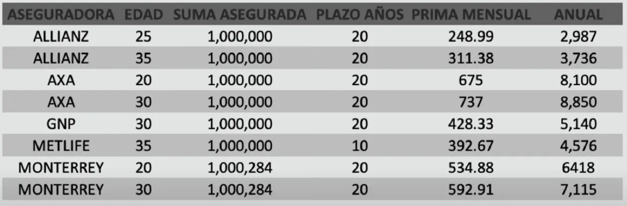 Esta es una tabla comparatiava de los costos y la suma asegurada